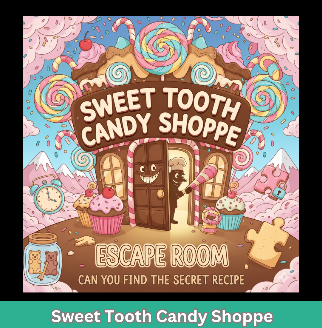 Think you and your team can find the top secret recipe for the highly anticipated new candy that will be making its debut at "Sweet Tooth Candy Shoppe"? You have one hour to complete the objective.